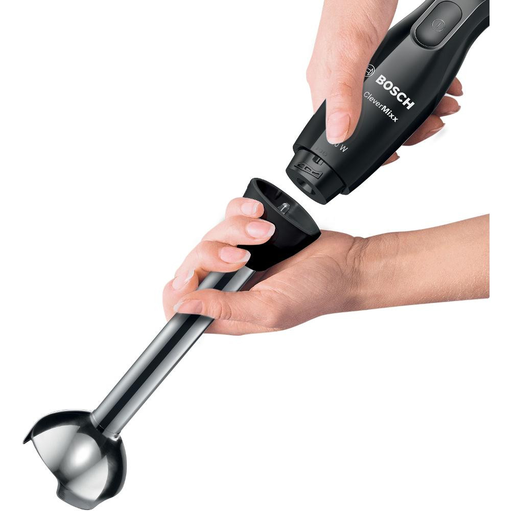 A fekete színű Bosch CleverMixx turmixgép ergonomikus fogantyúval rendelkezik, amely tökéletesen illeszkedik a kézbe. Kis súlyának köszönhetően könnyen és kényelmesen használható.